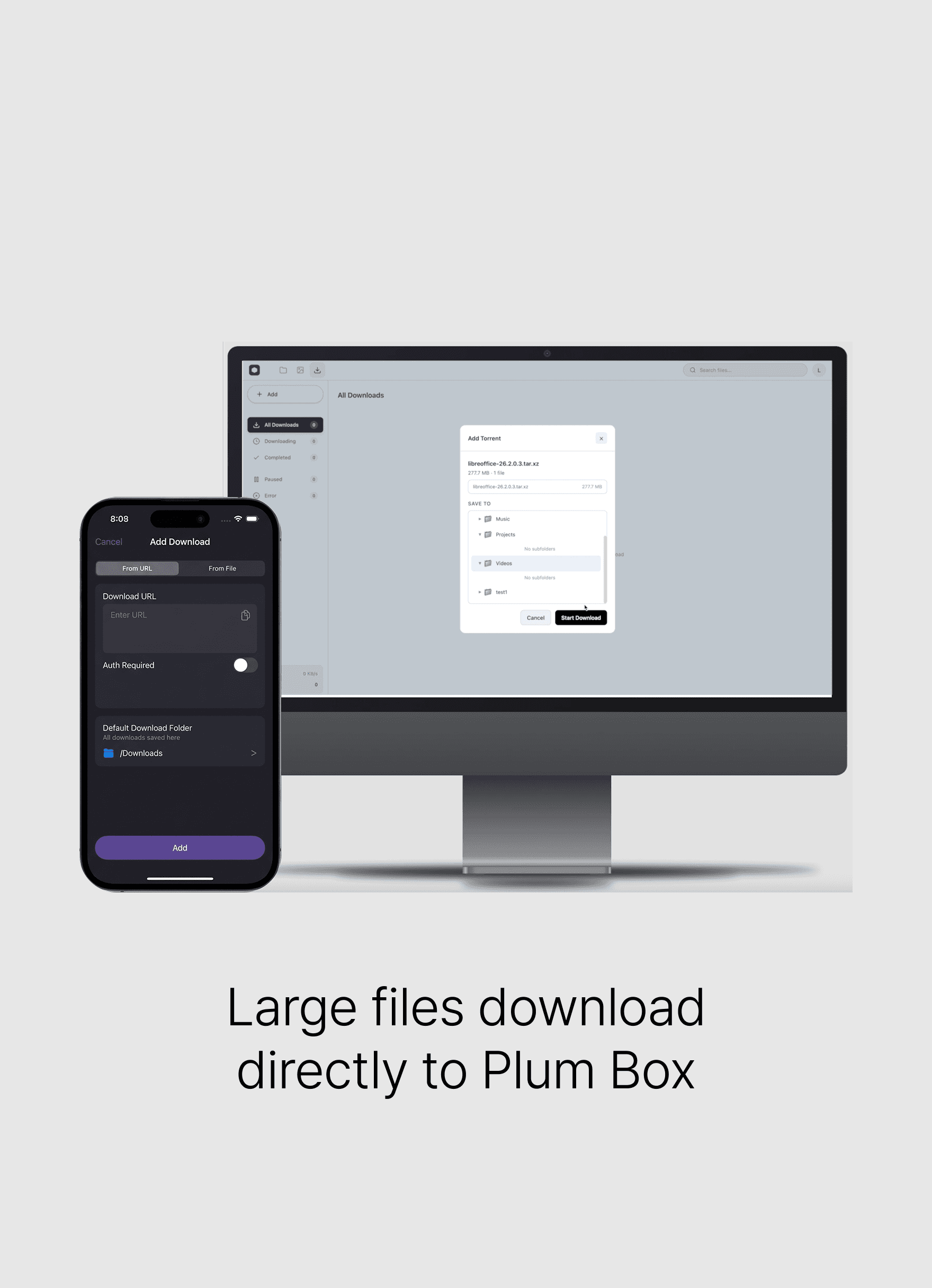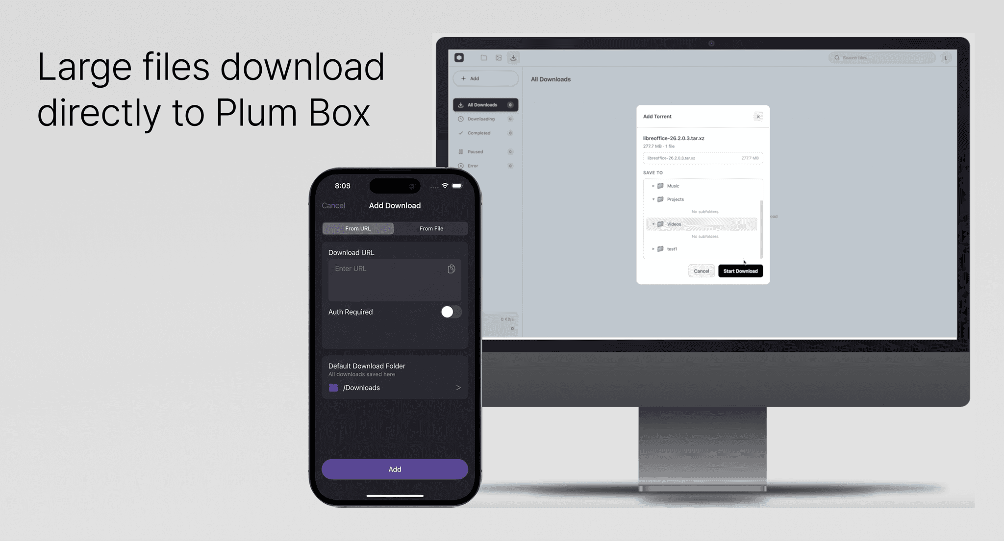 To save smartphone storage space, large files are downloaded directly to Plum Box. Download quickly and conveniently without using your smartphone.