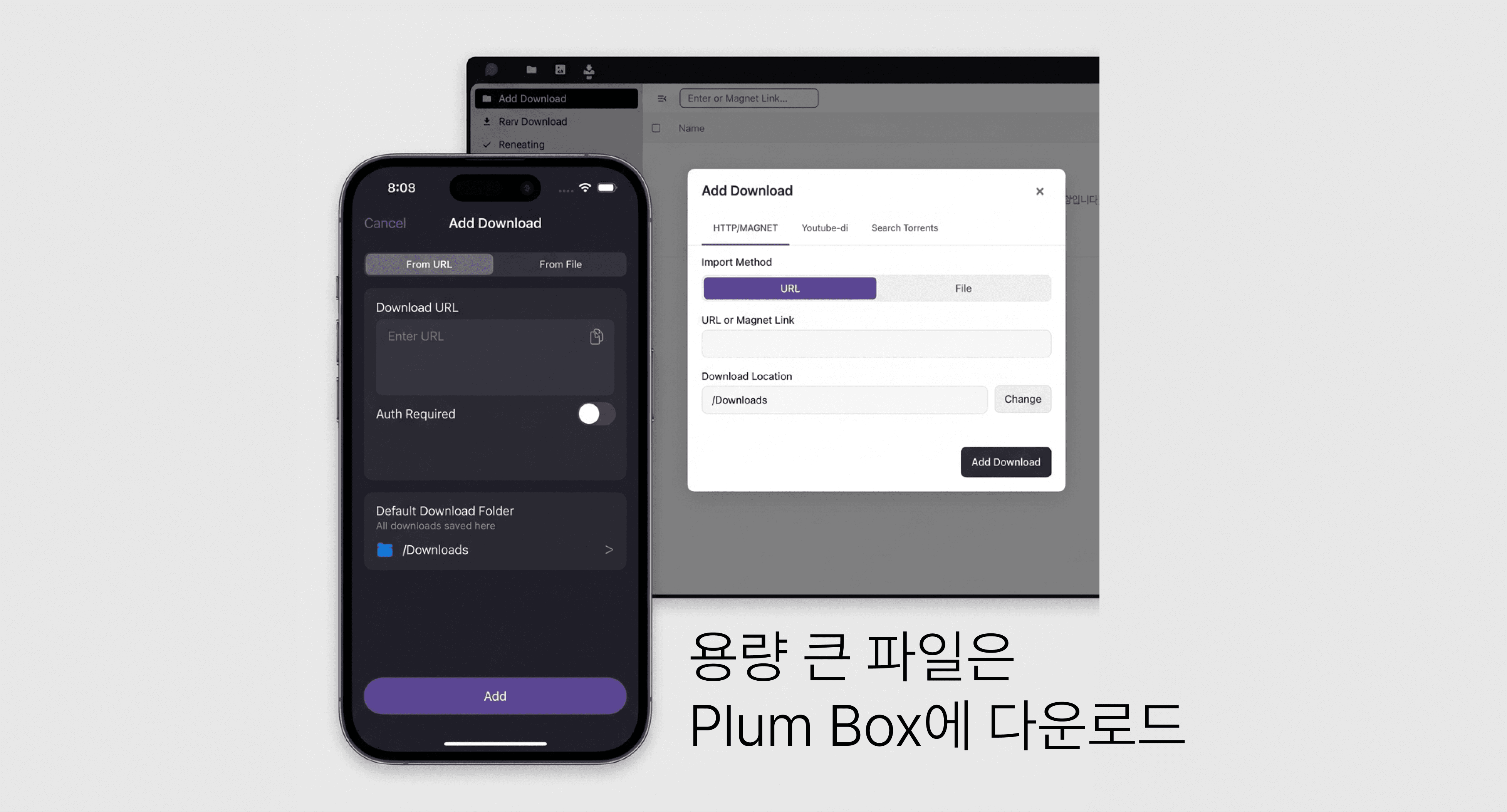 스마트폰 용량 절약을 위해 대용량 파일은 Plum Box에 직접 다운로드합니다. 멀티커넥션으로 빠르게 받고, 필요할 때만 스마트폰으로 확인하세요.